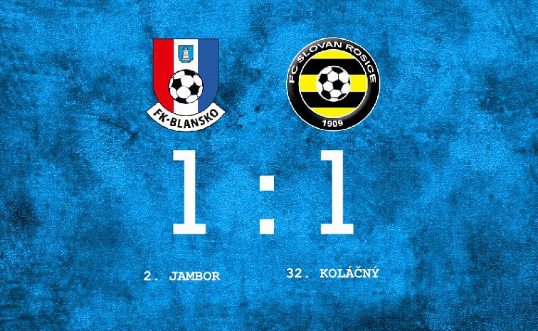 Hosté srovnali z nenápadné akce. Ve 32. minutě po dalším závaru ve vápně Blanska míč doputoval k Jiřímu Koláčnému, který volejem poslal skákavý míč do brány Nešetřila, přesněji k jeho pravé tyči. Nebyla to prudká střela, domácí gólman ale bohužel vůbec nic neviděl - 1:1. Srovnaný stav nakopl spíš blanenské hráče a do konce poločasu byly k vidění 2 zajímavé situace. Nejprve poslal Porč (nejlepší hráč utkání) zajímavý balón, k ohrožení branky Rosic ale nedošlo. Poté avšak ve vápně upadl domácí kapitán Smrčka a toto už mohla být penalta. Rozhodčí situaci jako faulovou neposoudil. O chvíli později měl poté skvělou šanci Sedlák, Zádrapu v hostující bráně, který byl vyběhlý velmi vysoko, ale nepřeloboval.