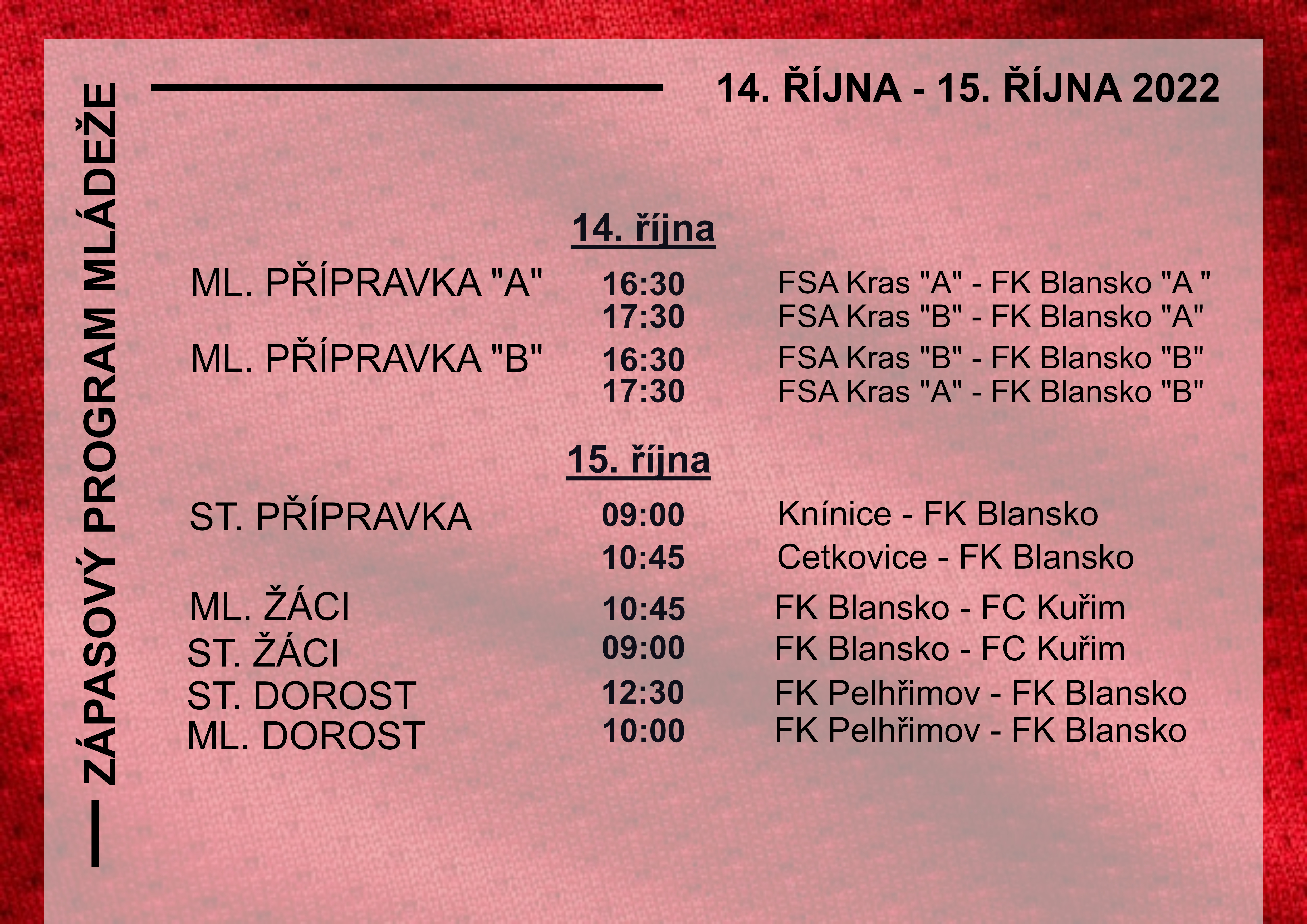 Do utkání jsme vstoupili velmi aktivně a po prvních skvělých herních příležitostí jsme se dostali do jednobrankového vedení. Tuto akci bych chtěl vyzdvihnout, protože vystihuje přesně naši hru, kterou bychom se chtěli prezentovat. Gólman rozehrál míč do strany hřiště na obránce, ten přihrál na střed volnému záložníkovi, on přihrál na krajního záložníka, dva naši hráči v útoku navázali obránce a odtáhli je mimo střední část hřiště, po krásném obejití protihráče přišla přihrávka středem hřiště, která našla našeho útočníka Davida Dračku, který perfektně převzal míč a krásnou střelou na zadní tyč otevřel skóre zápasu. Tato akce se musela líbit všem přítomným divákům, a i trenéři soupeřova mužstva tuto akci ocenili potleskem. V další části utkání se hra vyrovnala, útoky se střídali na obou stranách a z jednoho krásného přečíslení dostal přihrávku na velké vápno Adam Nejezchleb, který poslal na bránu nechytatelnou střelu po zemi k tyči a vyrovnal skóre před koncem prvního poločasu na 2:2. Díky tomu, že někteří naši hráči ročníku 2007 nastoupili za starší dorost, tak jsme na začátku druhého poločasu prostřídali některé posty a zaměřili se na držení míče. Bohužel jsme se nevyvarovali herních chyb a soupeř dokázal hned dvě naše chyby potrestat a dostal se do dvoubrankového vedení. Naši čerství hráči dokázali tým zvednout, a i díky jejich podpoře jsme dokázali po perfektně sehraném nacvičeném rohovém kopu, Ondřejem Badalem snížit na rozdíl jedné branky.Za stavu 3:4 jsme si vytvořili ještě velmi slibné příležitosti na vyrovnání, ale soupeř nám skórovat už neumožnil a při poslední jejich útočné akci v nastaveném čase jsme ještě jednou inkasovali. Chtěli bychom hráčům poděkovat za předvedenou hru, především v prvním poločase a za posledních 15 minut v druhém poločase. S trenéry doufáme, že navážeme na slibné výkony a v sobotu 15.10.2022 se v Pelhřimově popereme o další body do tabulky.
