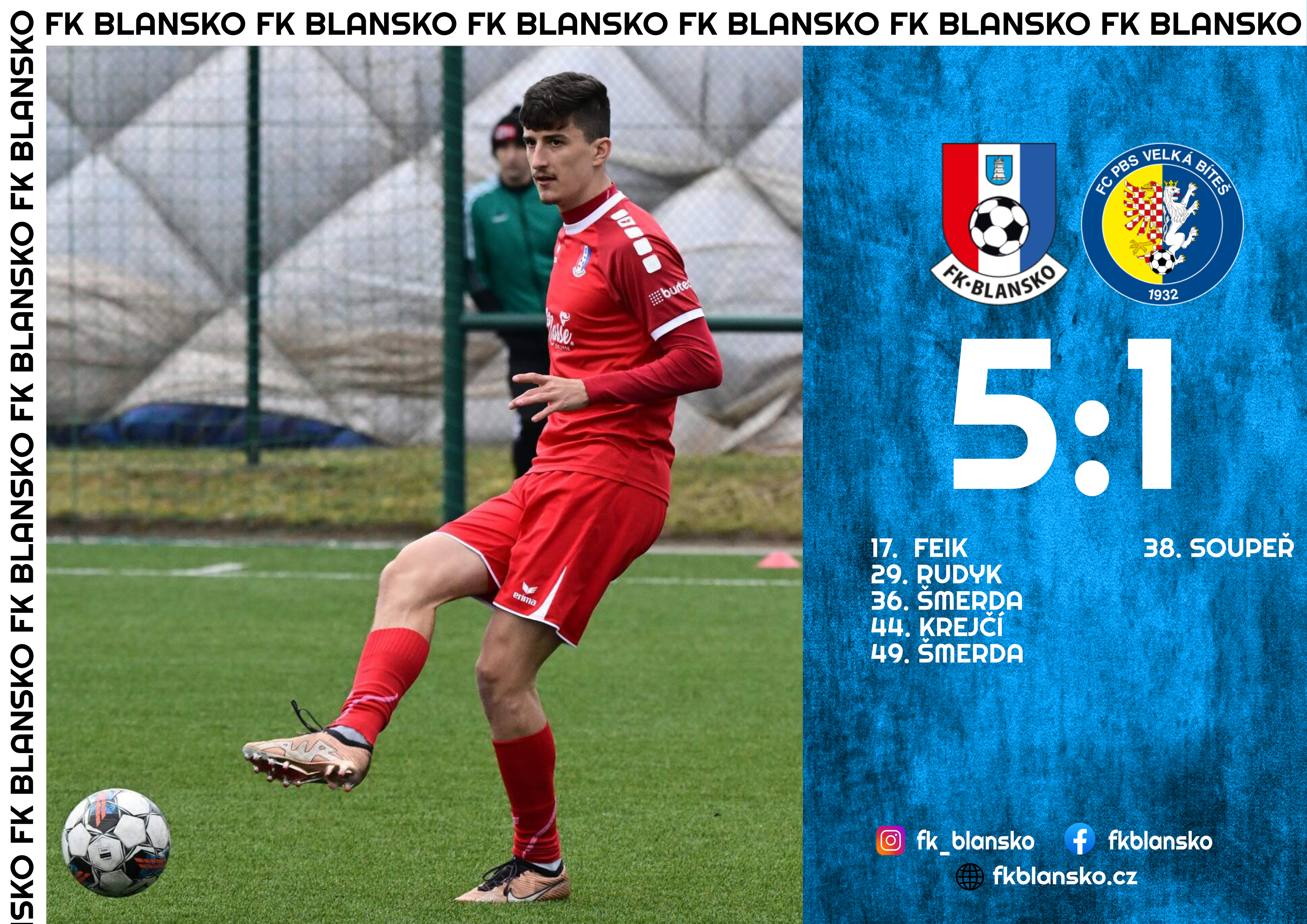 Ve druhém zápase zimní přípravy hostili blanenští fotbalisté na domácí půdě mužstvo Velké Bíteše. Hosté byli v úvodu zápasu aktivnější, ale v 17. minutě skórovalo jako první Blansko, když se střelou ze 30 metrů prosadil Feik. Blanenský tým postupně přebral iniciativu a ve 26. minutě to bylo už o dva góly po premiérové brance Davida Rudyka. Další branku přidal po přízemním centru Adamce na zadní tyči nikým nekrytý Šmerda. Hosté zanedlouho snížili po akci zprava na 3:1. Těsně před odchodem do kabin se znovu měnilo skóre. Bíteš chybovala v rozehrávce, první zakončení Krejčího ještě stihnul vykopnout z brankové čáry obránce, míč se dostal k Adamcovi a po jeho přihrávce se Krejčí podruhé nemýlil - 4:1. Ve 49. minutě se po přiklepnutí od Adamce prosadil nádhernou střelou z hranice šestnáctky svým druhým gólem Dominik Šmerda a stav byl už 5:1. Ve zbývajících minutách kvalita hry lehce opadla a diváci už žádnou branku neviděli. Svěřenci kouče Kuglera si tak připisují v rámci přípravy druhé vítězství.