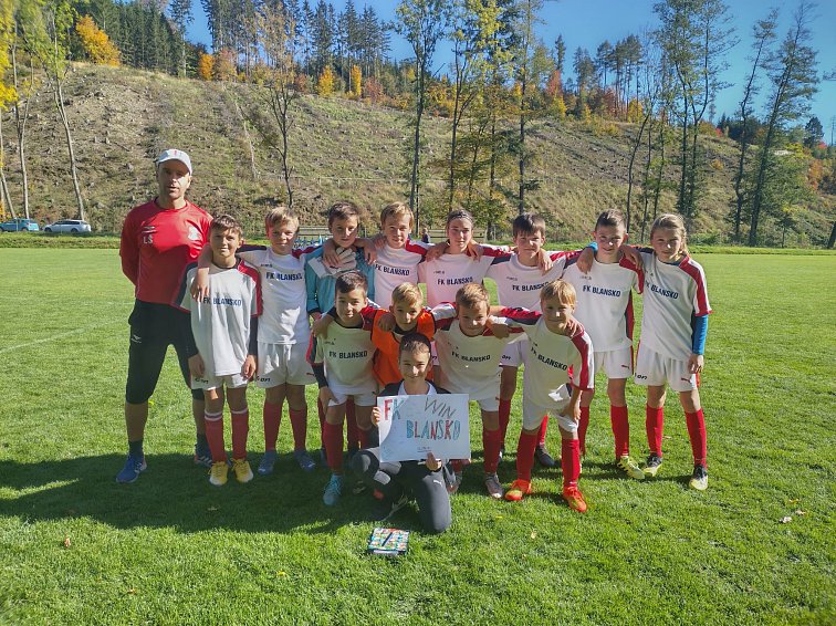 Věděli jsme, že nás nečeká lehké utkání, ale do zápasu jsme nastoupili s odhodláním předvést co nejlepší výkon, jaký umíme. V prvním poločase jsme nebyli horším týmem a dokázali jsme si vytvořit řadu šancí, které skončili pouze na tyči v podobě parádních střel Filipa Slouky a Honzy Kopky. Ve 28. minutě jsme se už ale mohli radovat, a to, když poprvé v tomto zápasu naskočil náš benjamínek Sebastian Farník r.2012, který "vymotal" 3 soupeřovy hráče a levačkou zakončil. Gólman byl však na svém místě a střelu vyrazil do tyče, kde pohotový Honza Kopka míč dorazil do prázdné branky, vedeme 1:0! V poločase se (plánovaně) vystřídali naši gólmani, kteří nás v zápase podrželi, zejména Míša Zouhar, který ve druhé polovině utkání doslova vychytal 3 tutové góly soupeře. Ve druhém poločase jsme se už do šancí nedostávali, bojovali jsme však do samotného konce. Po závěrečném hvizdu rozhodčího se doslova spustila lavina radosti a euforie, pro kterou vlastně tohle všichni hráči a trenéři v Blansku děláme! Samotní hráči si pak užili děkovačku s rodiči a fanoušky, kterým děkujeme za maximální podporu. V kabině pak následoval "Vysoký jalovec..."Kluci se přesvědčili, že se dá hrát i se soupeřem z přední části tabulky a svým výkonem i výsledkem posílili své sebevědomí do dalších zápasů.