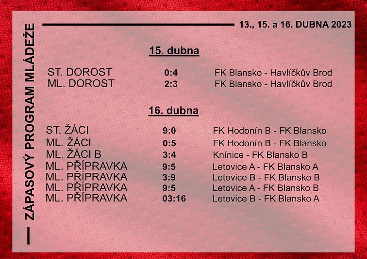 První jarní kolo jsme měli odehrát na hřišti v Letovicích. Vzhledem k velkým dešťovým srážkám, jsme se dohodli, že zápas odehrajeme v Blansku na umělé trávě. Když jsem psal na podzim po zápase s Letovicemi, že jsme viděli nejlepší výkon v sezoně, tak na ty slova mohu navázat. Byl to sice první zápas, ale v obou týmech velká kvalita a chuť hrát fotbal. Odvaha, bojovnost, krásné branky a skvělé zákroky od našeho brankáře Davida Haška. Je radost se dívat na všechny kluky a holky, jak je hra baví. V takovém přístupu a nadšení, by jsme chtěli pokračovat i nadále. Doufáme, že na tohle utkání navážou i zítra ostatní kluci v přátelském utkání ve Vyškově. Příští zápas přivítáme na domácí půdě kluky z Drnovic a Knínic.