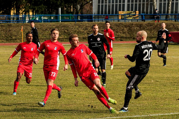 Úvod duelu s Třincem připomínal klasický první jarní zápas, hru obou týmů brzdily nepřesnosti. Hosté poprvé zahrozili po devatenácti minutách hry, proti nebezpečné hlavičce ale nakonec brankář Halouska zasahovat nemusel. První šanci domácích měl po individuální akci novic v sestavě Francouz Davy, po kličce na osu a následné střele zasahoval Pastornický.